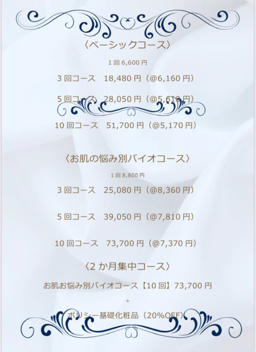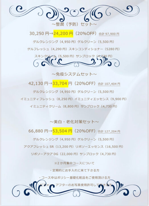 ●2か月間集中コース+ポリシー基礎化粧品のメニューを30%OFF(メニューは通常20%OFFになっています)